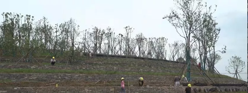 西入口建設(shè)現(xiàn)場(chǎng)的兩側(cè)山坡上層層疊疊十多道“梯田”十分引人注目,靠近入口的部分已經(jīng)種上了烏桕等喬木。這些“梯田”式的臺(tái)階叫跌級(jí)花谷,原狀是由兩座崗地所夾形成的谷地,依托原地形打造出了跌級(jí)花谷擋墻。此處以鳳冠霞帔為設(shè)計(jì)理念,由“從荊山飛來一只鳳凰,棲息于園博園之中”的故事引申而來,仿造鳳凰的尾羽形態(tài)形成平面布局,呈流線型蜿蜒入內(nèi)。待季節(jié)適宜時(shí),擋墻內(nèi)將種上紅、橙、粉、黃等多色彩的月季花,再以桂花、櫻花等花樹點(diǎn)綴,屆時(shí)兩側(cè)萬花盛開、五彩繽紛,營(yíng)造出熱情好客的視覺效果。