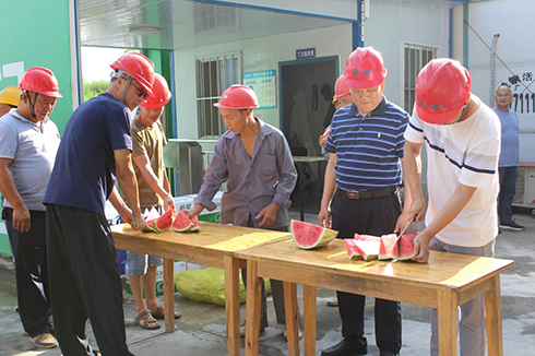 “大家都休息一下 ,來吃塊西瓜解解渴!”在施工現(xiàn)場,慰問小組大聲吆喝道,并把切好的西瓜分發(fā)到作業(yè)人員手中,對他們的辛勤付出表示感謝,并叮囑他們越是高溫極端天氣越要注重個人安全防護,戴好安全帽、系好安全帶,確保高溫期間的安全生產(chǎn)。