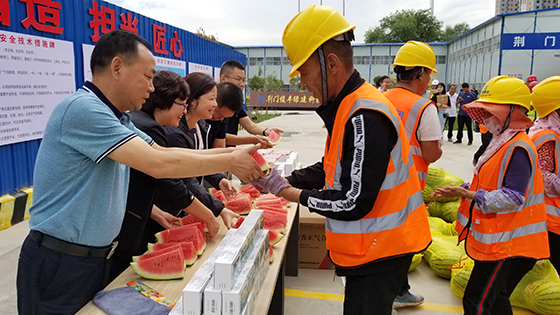 隨后,調(diào)研慰問(wèn)組一行頂著炎炎烈日在項(xiàng)目現(xiàn)場(chǎng)開(kāi)展送清涼活動(dòng),將西瓜、飲料、防暑藥品等慰問(wèn)物資送到施工人員手中,面對(duì)酷暑,一線人員“搶時(shí)間,趕進(jìn)度”,強(qiáng)光下個(gè)個(gè)曬得黝黑。咫尺貼心的問(wèn)候,帶給千里之外項(xiàng)目干部職工潤(rùn)徹心田的慰藉,激發(fā)了必勝的豪情。銀川團(tuán)隊(duì)及參建各方紛紛表示,有決心有信心,用汗水和業(yè)績(jī)?yōu)槭谐强丶瘓F(tuán)在祖國(guó)大西北凝鑄閃亮的金字招牌,為集團(tuán)“走出去”戰(zhàn)略打下堅(jiān)實(shí)的基礎(chǔ)。(文:代加燈 李曉旭;圖:趙鋒)
