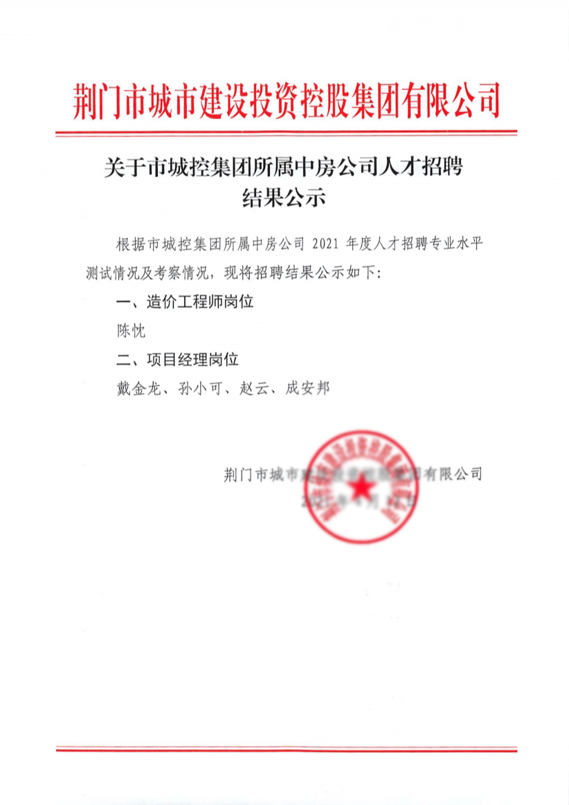 關(guān)于市城控集團所屬中房公司人才招聘結(jié)果公示