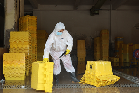 志愿者清洗醫(yī)廢收集箱