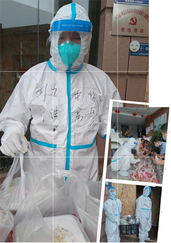 志愿者徐剛?cè)A跟同事為隔離人員送生活物資