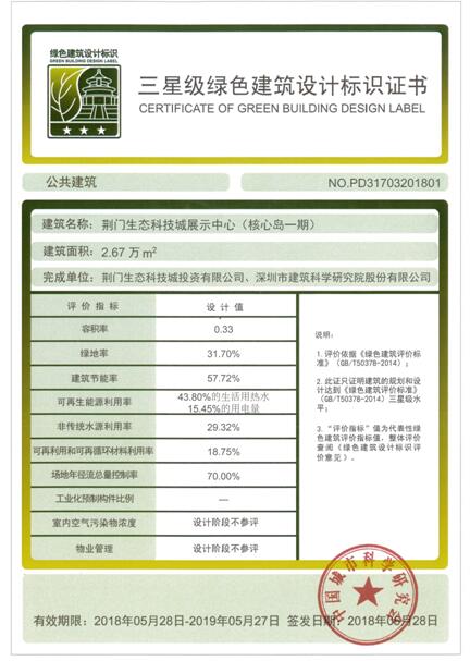 圖為生態(tài)科技城三星級(jí)綠色建筑設(shè)計(jì)標(biāo)識(shí)證書