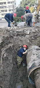 當(dāng)日早7時(shí)許,維修公司接到報(bào)警電話反映興隆大道三干渠管理處南側(cè)附近馬路上出現(xiàn)大量積水,懷疑有自來水管線爆裂。接到消息的維修公司巡線人員早飯都沒顧上吃就直奔現(xiàn)場(chǎng)。抵達(dá)現(xiàn)場(chǎng)后,發(fā)現(xiàn)馬路上水流湍急,水已經(jīng)順著出水點(diǎn)漫延到交通要道上,情況十分緊急,他們立即將情況上報(bào)維修公司,市供水總公司經(jīng)理袁天軍迅速安排維修人員準(zhǔn)備搶修機(jī)具設(shè)備,并馬上前住現(xiàn)場(chǎng)進(jìn)行搶修。 上午8點(diǎn),漏點(diǎn)確定,搶修作業(yè)立即展開。挖開溝槽后,發(fā)現(xiàn)供水管線的漏水量較大,必須進(jìn)行停水才能開展后續(xù)搶修工作。現(xiàn)場(chǎng)負(fù)責(zé)人立即聯(lián)系供水調(diào)度監(jiān)控中心配合對(duì)漏水管線進(jìn)行停水作業(yè),告知客服中心搶修地點(diǎn)與停水范圍,并通過市供水總公司微信平臺(tái)將停水信息推送給用戶。同時(shí),督促現(xiàn)場(chǎng)架起設(shè)施防護(hù)柵,提高警惕,確?,F(xiàn)場(chǎng)搶修施工安全。